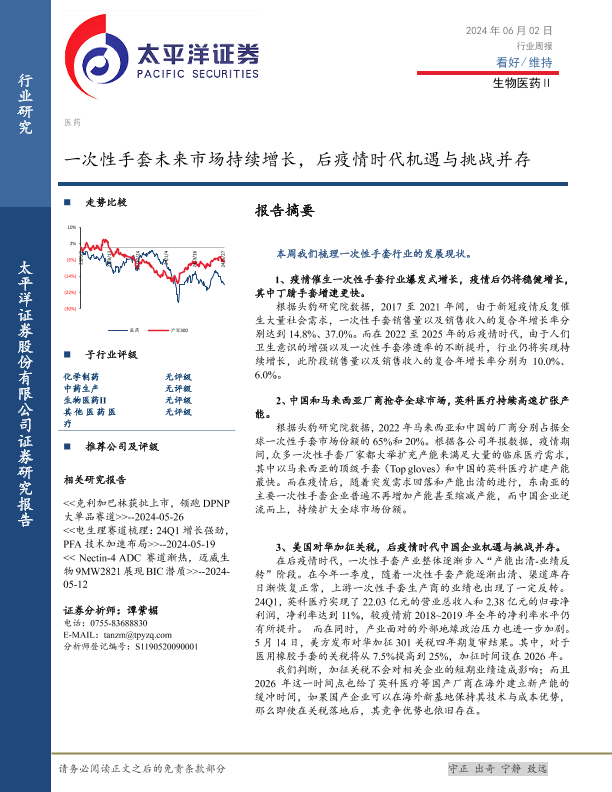 【太平洋证券】【20240602】生物医药Ⅱ行业周报:一次性手套未来市场持续增长,后疫情时代机遇与挑战并存-17页