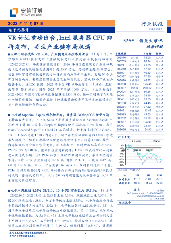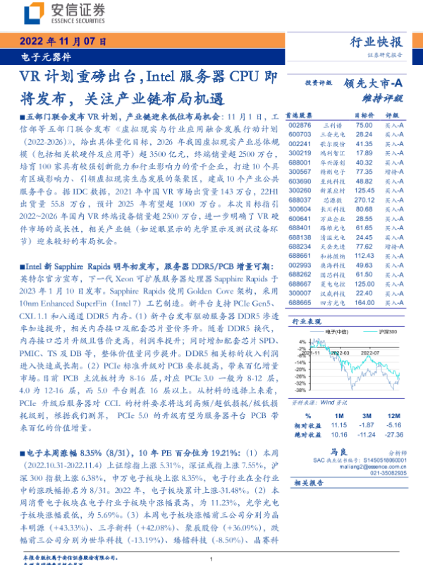 【安信证券】【20221107】电子元器件行业快报:VR计划重磅出台,Intel服务器CPU即将发布,关注产业链布局机遇-16页
