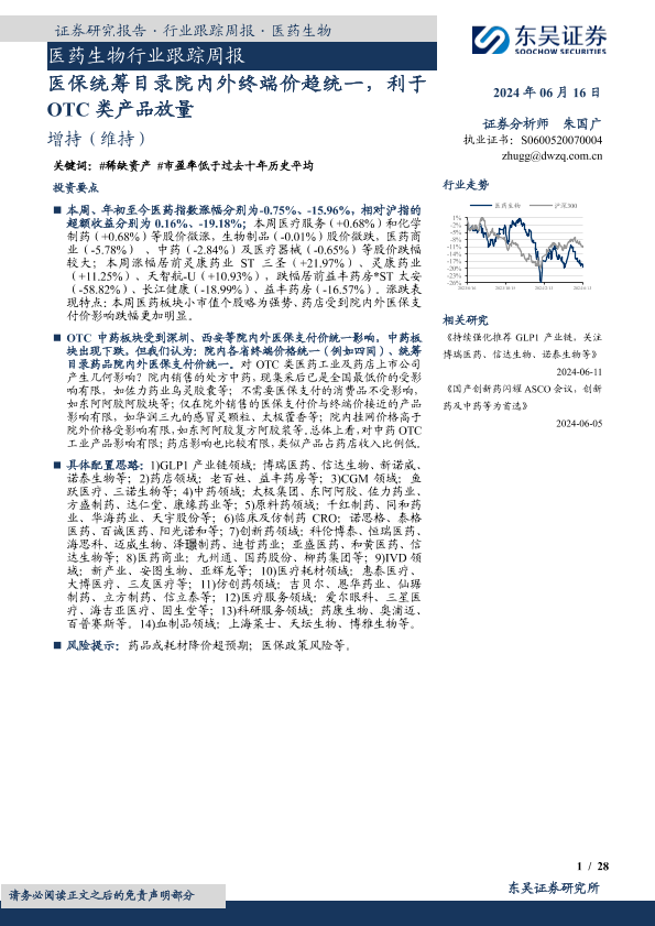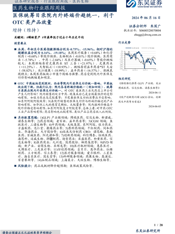 【东吴证券】【20240616】医药生物行业跟踪周报:医保统筹目录院内外终端价趋统一,利于OTC类产品放量-28页