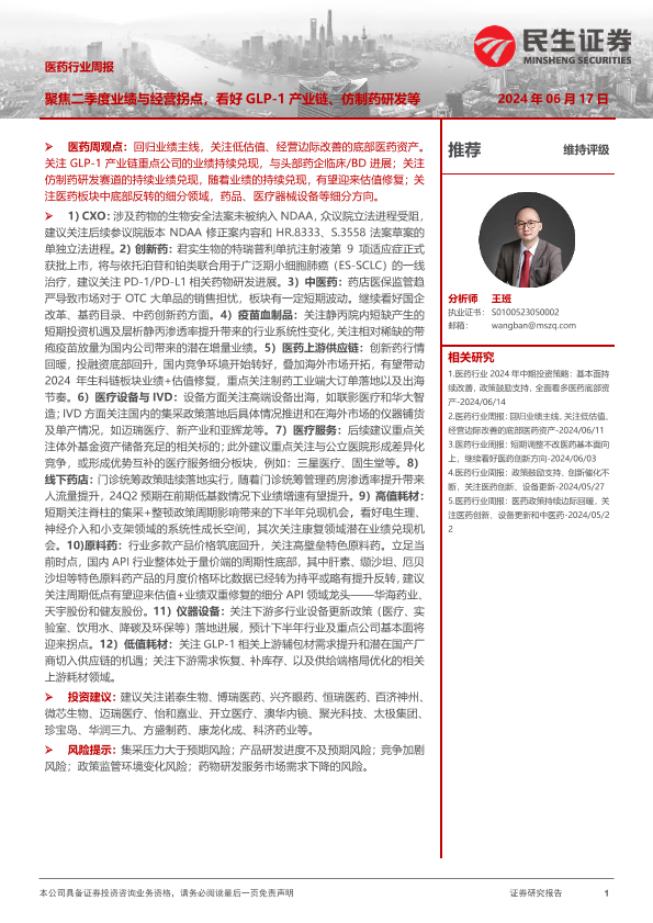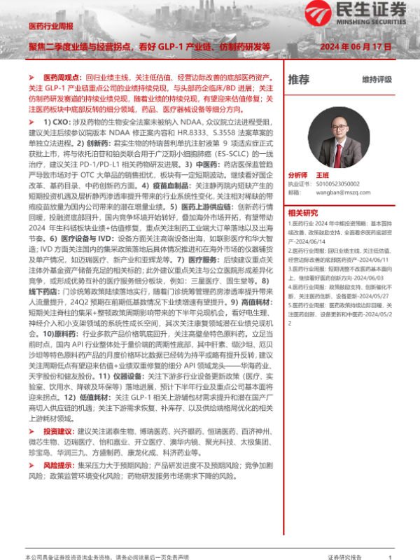 【民生证券】【20240617】医药行业周报:聚焦二季度业绩与经营拐点-24页