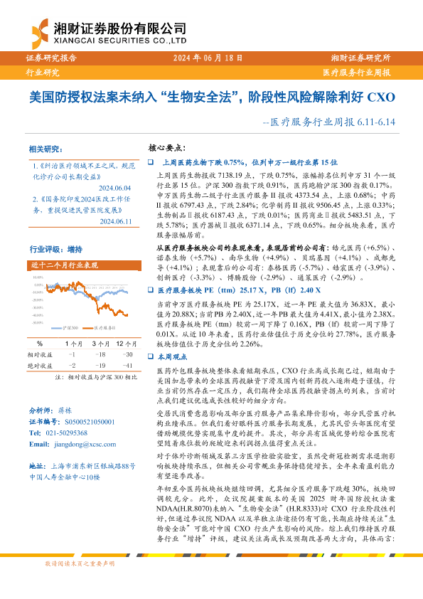 【湘财证券】【20240618】美国防授权法案未纳入“生物安全法”,阶段性风险解除利好CXO-10页