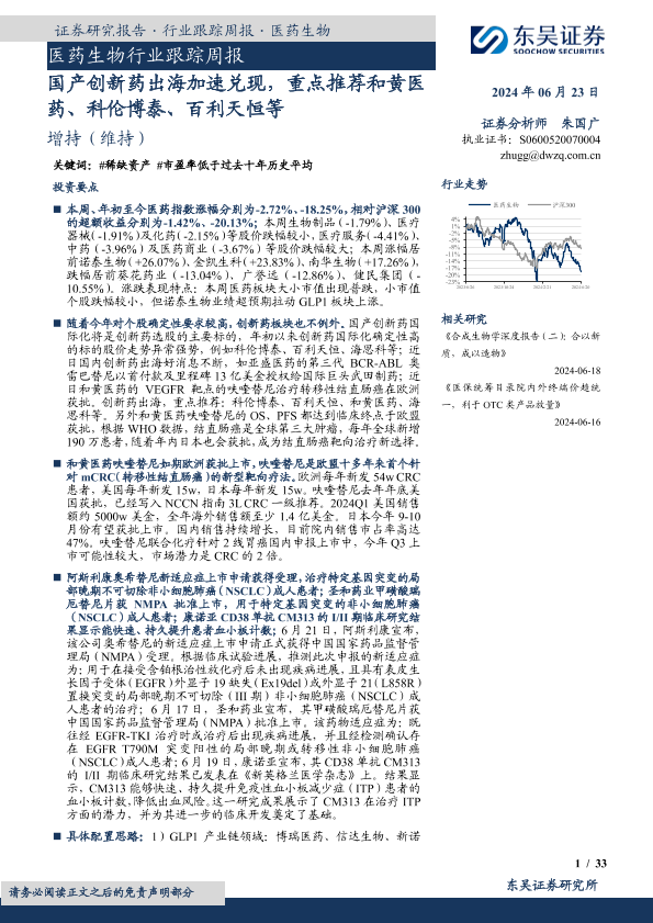 【东吴证券】【20240623】国产创新药出海加速兑现,重点推荐和黄医药、科伦博泰、百利天恒等-33页