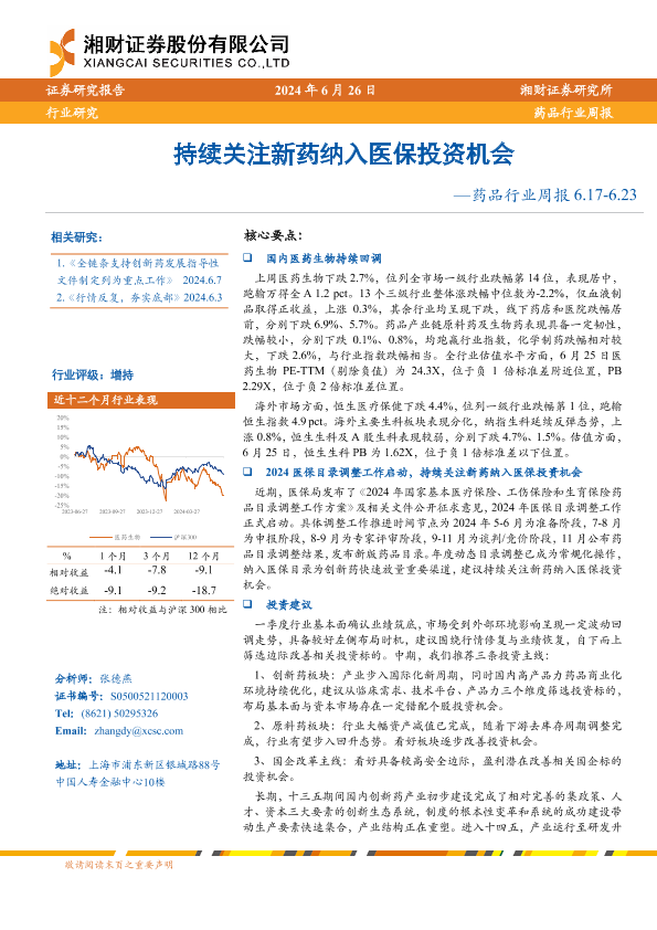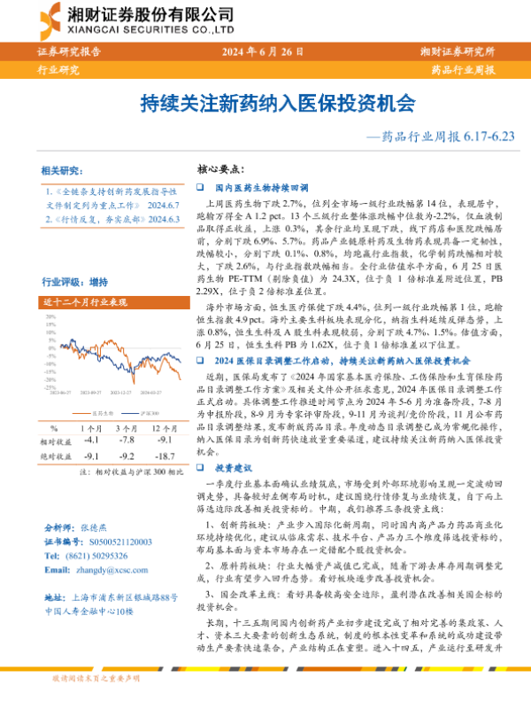 【湘财证券】【20240626】药品行业周报:持续关注新药纳入医保投资机会-11页