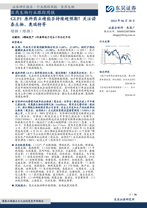 【东吴证券】【20240630】医药生物行业跟踪周报:GLP1原料药业绩能否持续超预期?-36页
