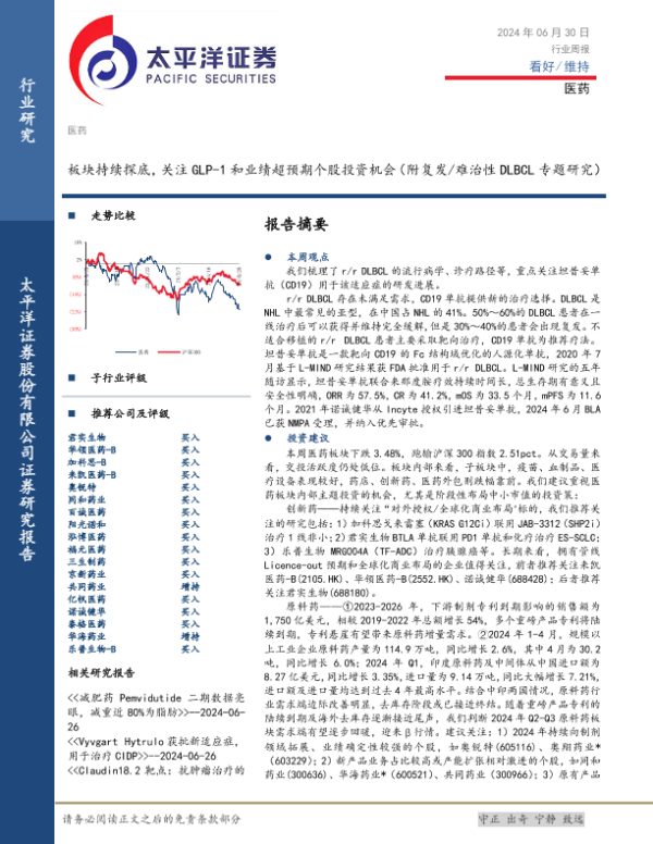 【太平洋证券】【20240630】医药行业周报:板块持续探底,关注GLP-1和业绩超预期个股投资机会-20页