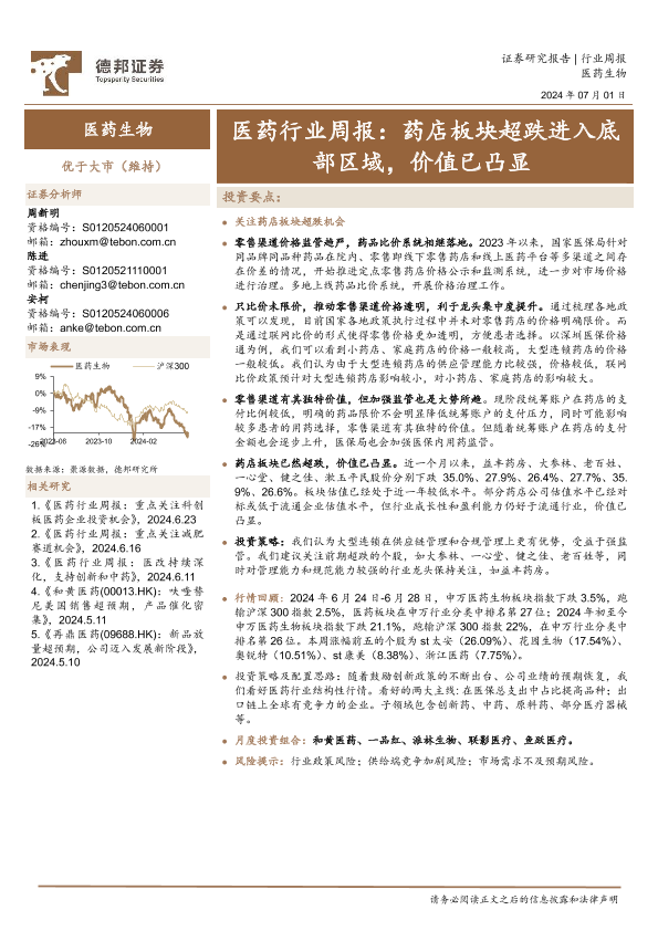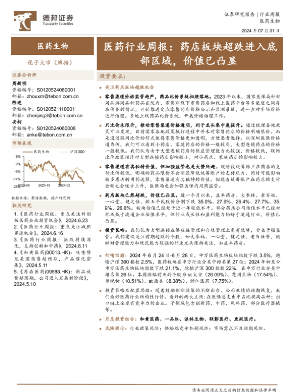 【德邦证券】【20240701】医药行业周报:药店板块超跌进入底部区域,价值已凸显-14页