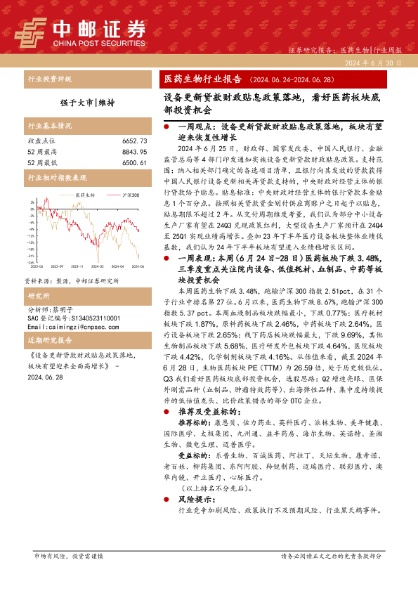 【中邮证券】【20240630】设备更新贷款财政贴息政策落地,看好医药板块底部投资机会-18页