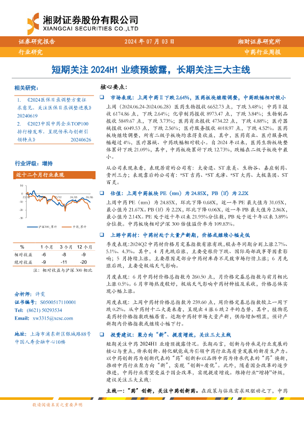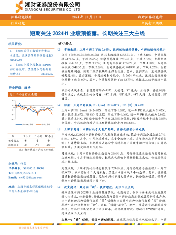【湘财证券】【20240703】中药行业周报:短期关注2024H1业绩预披露,长期关注三大主线-12页