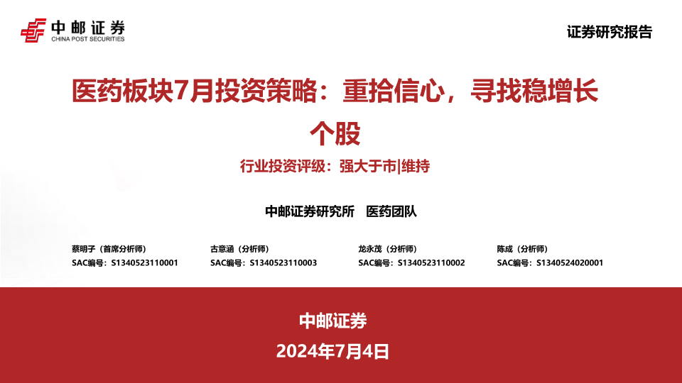 【中邮证券】【20240704】医药板块7月投资策略:重拾信心,寻找稳增长个股-18页