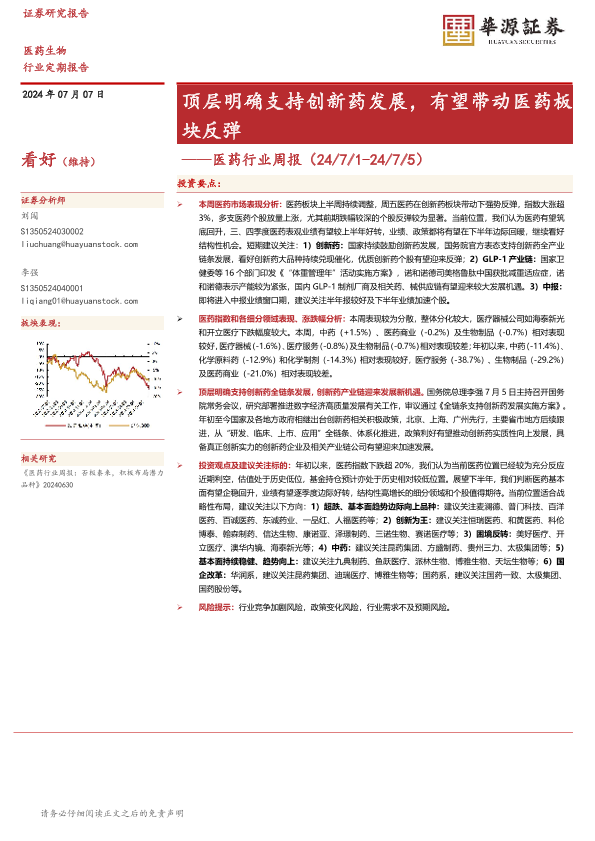 【华源证券】【20240707】医药行业周报:顶层明确支持创新药发展,有望带动医药板块反弹-12页