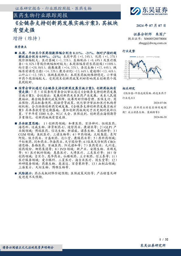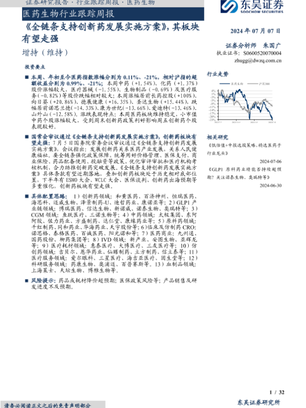 【东吴证券】【20240707】医药生物行业跟踪周报:《全链条支持创新药发展实施方案》,其板块有望走强-32页