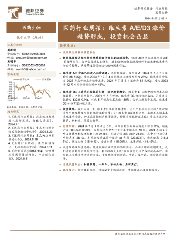 【德邦证券】【20240708】医药行业周报:维生素A E D3涨价趋势形成,投资机会凸显-13页