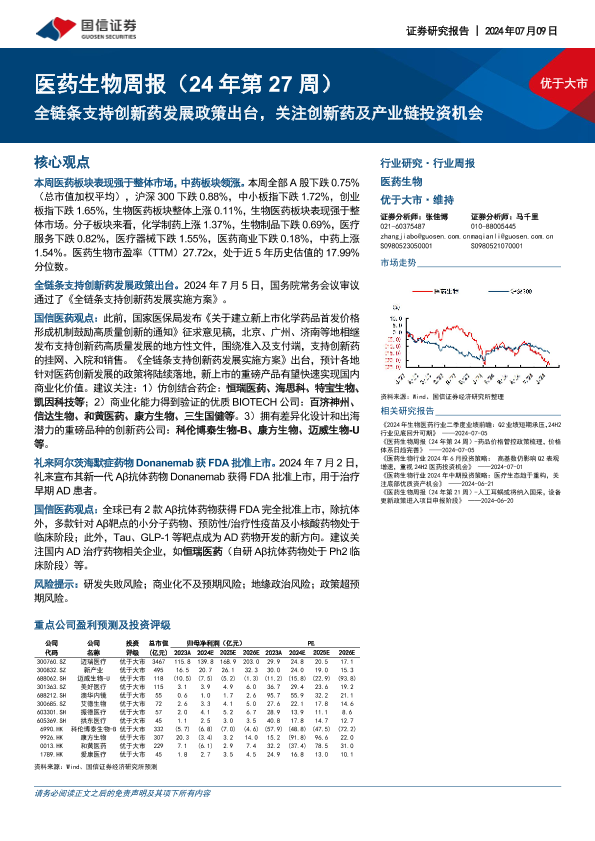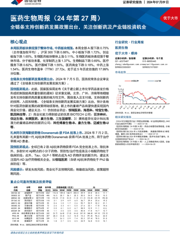 【国信证券】【20240709】医药生物周报:全链条支持创新药发展政策出台,关注创新药及产业链投资机会-19页