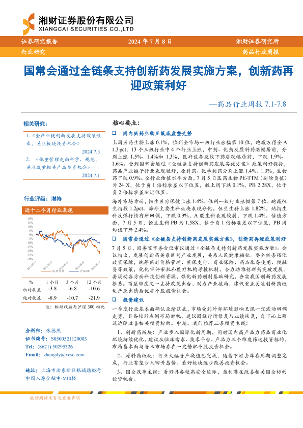 【湘财证券】【20240708】药品行业周报:国常会通过全链条支持创新药发展实施方案,创新药再迎政策利好-10页