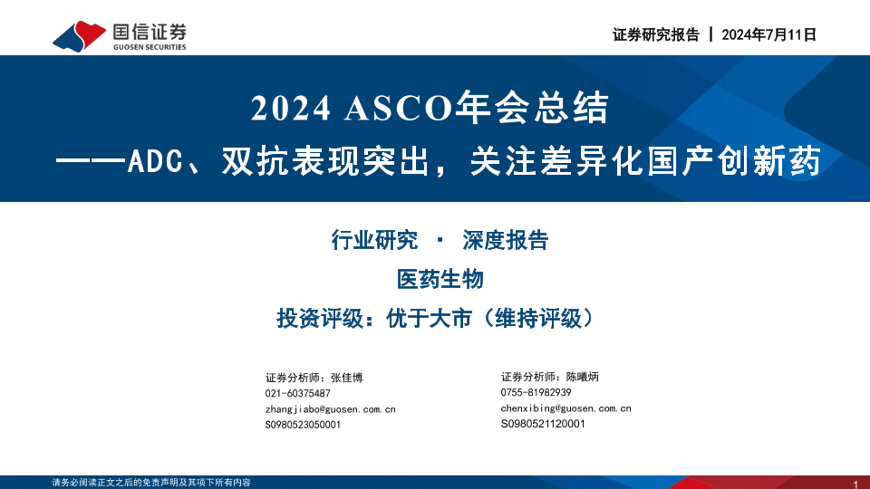 【国信证券】【20240711】2024 ASCO年会总结:ADC、双抗表现突出,关注差异化国产创新药-64页