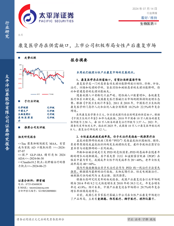 【太平洋证券】【20240714】生物医药Ⅱ行业周报:康复医学存在供需缺口,上市公司积极布局女性产后康复市场-19页
