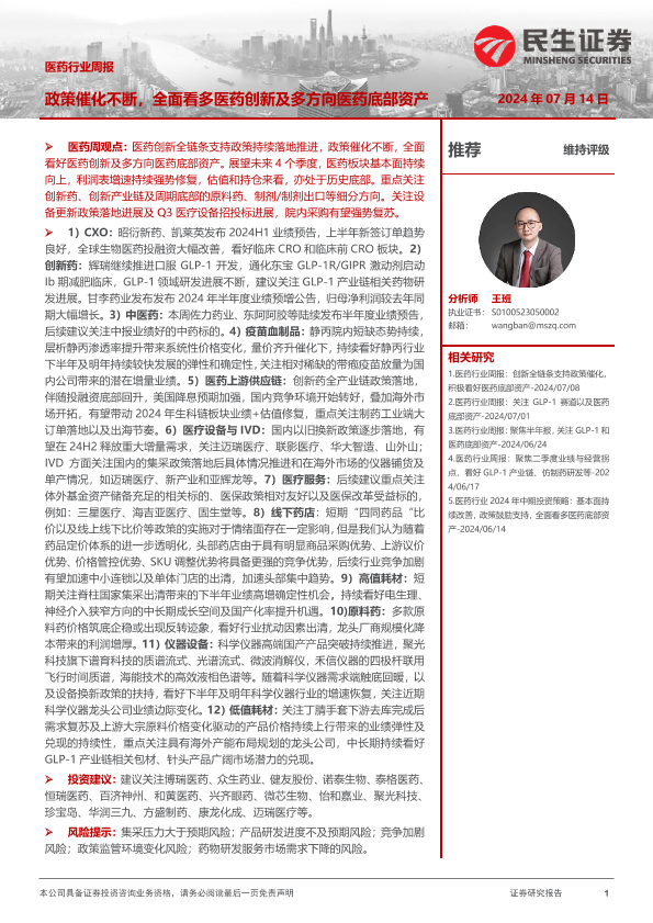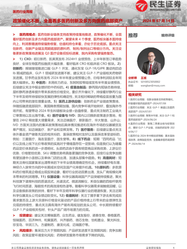 【民生证券】【20240714】医药行业周报:政策催化不断,全面看多医药创新及多方向医药底部资产-23页