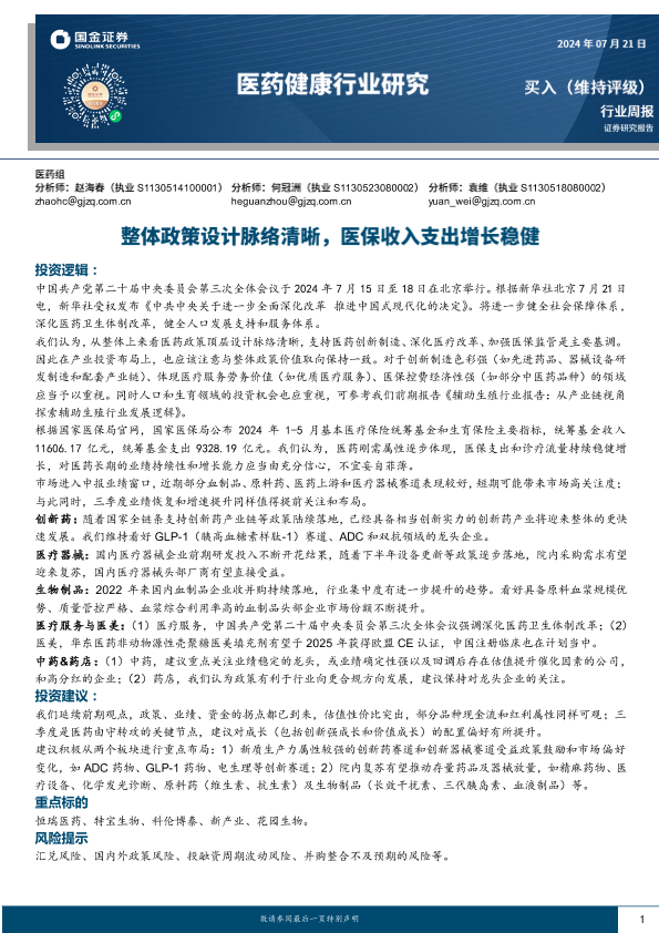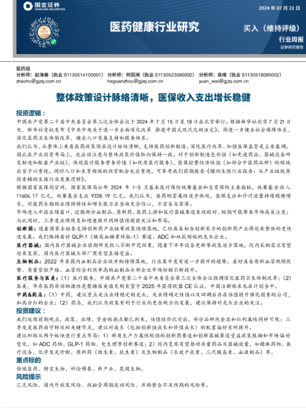 【国金证券】【20240721】医药健康行业研究:整体政策设计脉络清晰,医保收入支出增长稳健-14页