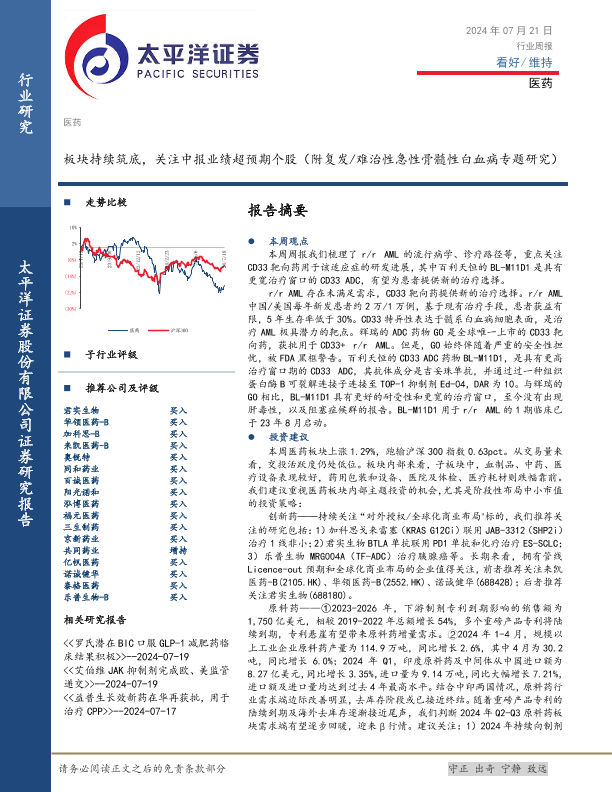 【太平洋证券】【20240721】医药行业周报:板块持续筑底,关注中报业绩超预期个股-20页