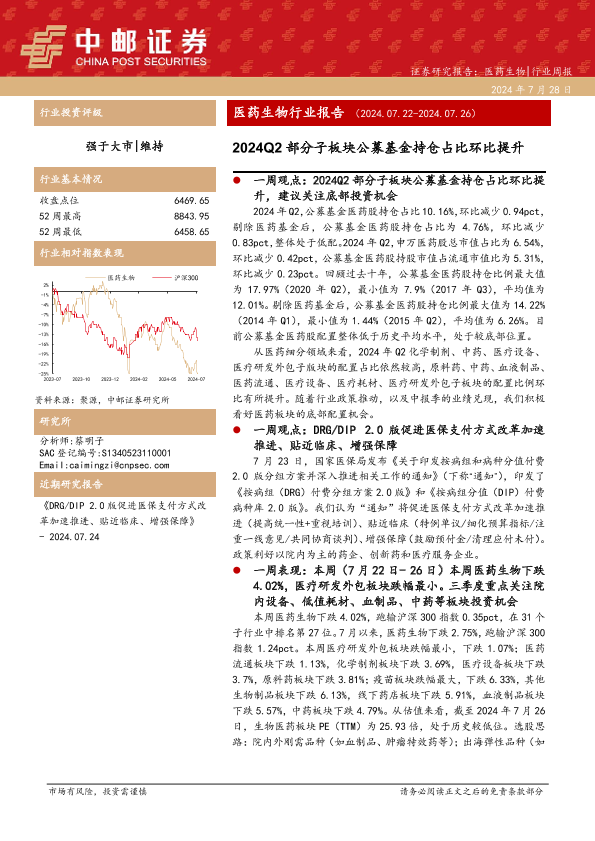 公募基金持仓 医保支付改革 医药生物 子板块分析 投资机会