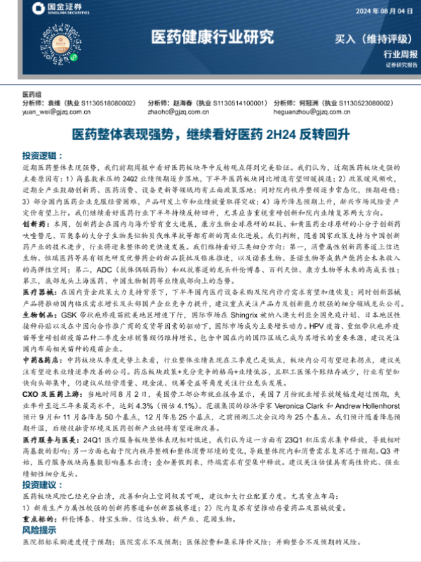 【国金证券】【20240804】医药健康行业研究:医药整体表现强势,继续看好医药2H24反转回升-17页