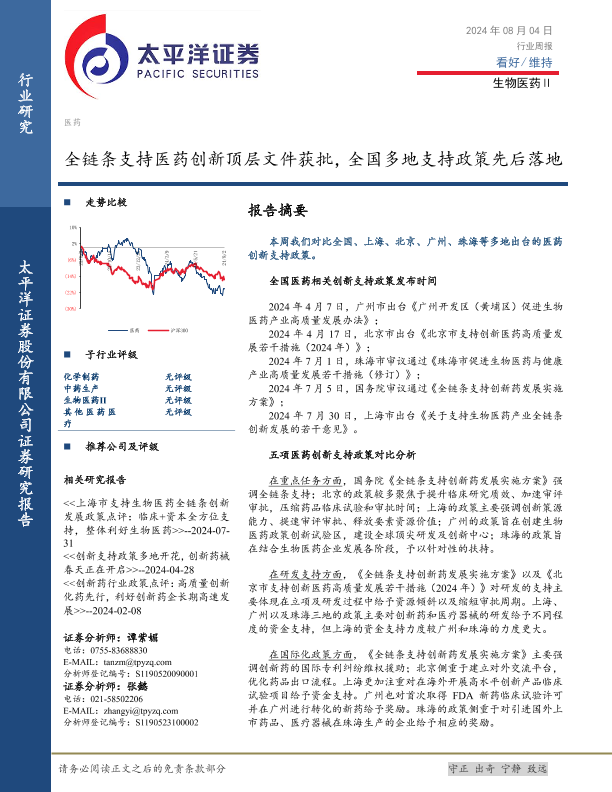 【太平洋证券】【20240804】生物医药Ⅱ行业周报:全链条支持医药创新顶层文件获批,全国多地支持政策先后落地-20页