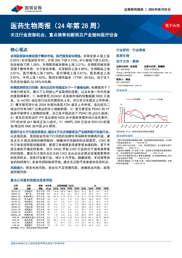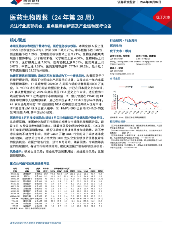 【国信证券】【20240805】医药生物周报:关注行业底部机会,重点推荐创新药及产业链和医疗设备-22页
