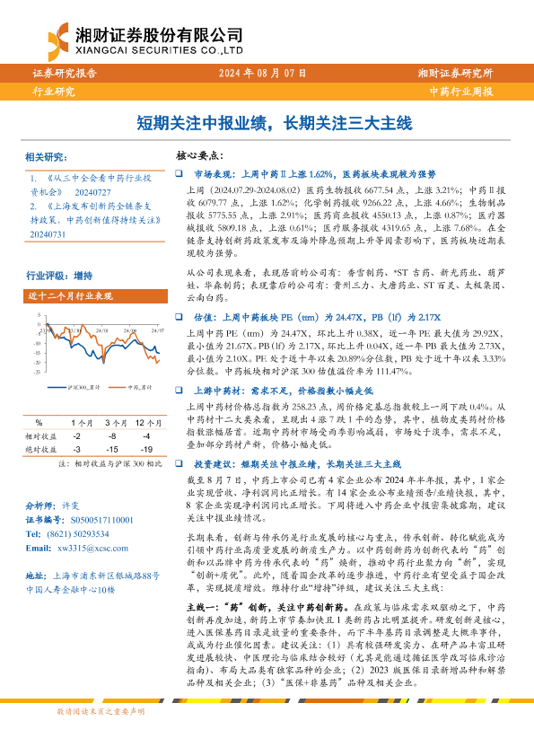 【湘财证券】【20240807】中药行业周报:短期关注中报业绩,长期关注三大主线-12页