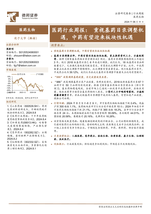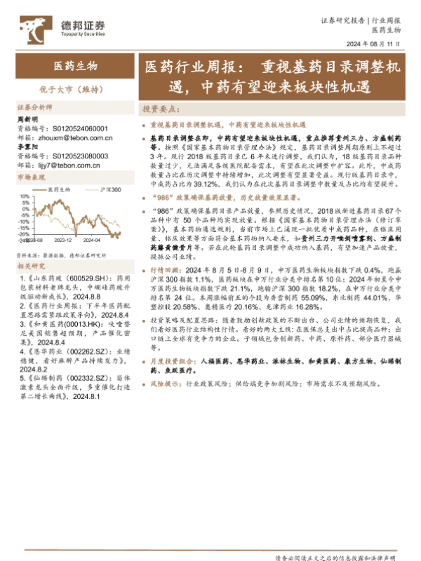 【德邦证券】【20240811】医药行业周报:重视基药目录调整机遇,中药有望迎来板块性机遇-13页