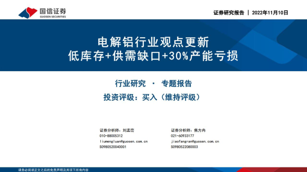 【国信证券】【20221110】电解铝行业观点更新:低库存+供需缺口+30%产能亏损-23页