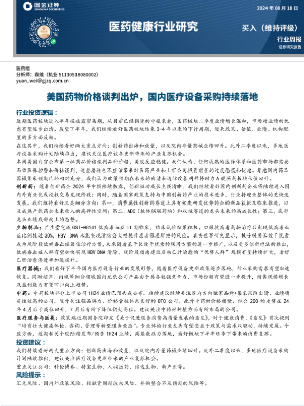 【国金证券】【20240818】医药健康行业研究:美国药物价格谈判出炉,国内医疗设备采购持续落地-21页