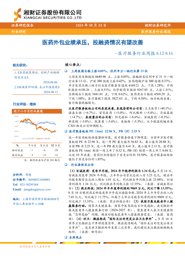 【湘财证券】【20240820】医疗服务行业周报:医药外包业绩承压,投融资情况有望改善-11页