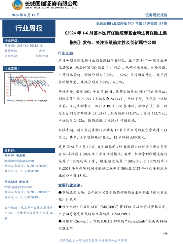 【长城国瑞证券】【20240819】2024年1-6月基本医疗保险统筹基金和生育保险主要指标发布,关注业绩确定性及创新属性公司-19页
