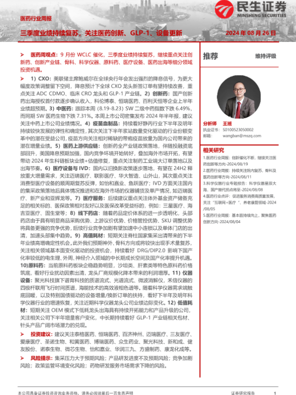【民生证券】【20240826】医药行业周报:三季度业绩持续复苏,关注医药创新、GLP-1、设备更新-21页