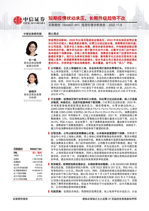 【中信证券】【20221108】百联股份(600827)投资价值分析报告:短期疫情扰动承压,长期升级趋势不改-38页