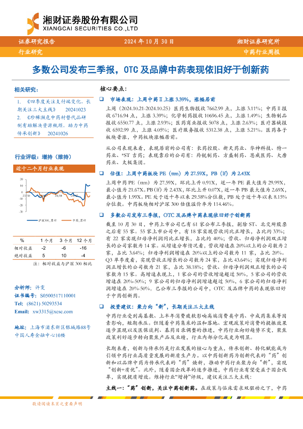 【湘财证券】【20241030】中药行业周报:多数公司发布三季报,OTC及品牌中药表现依旧好于创新药-12页