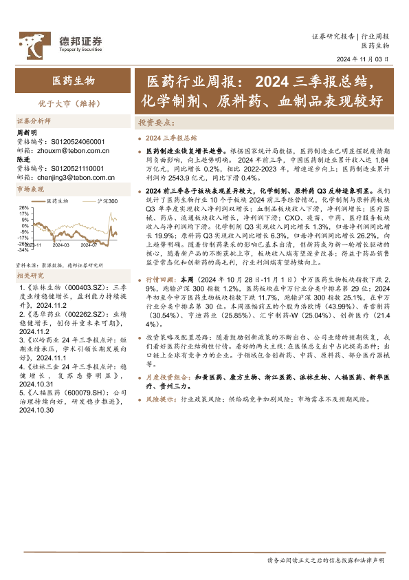 【德邦证券】【20241103】2024三季报总结,化学制剂、原料药、血制品表现较好-21页