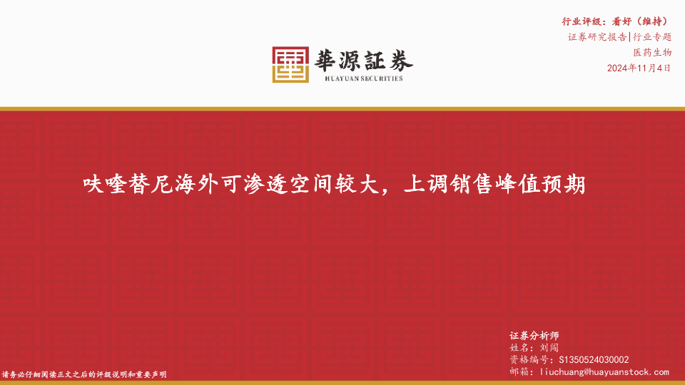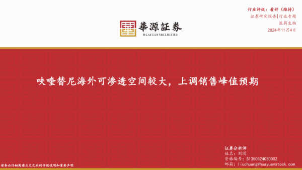 【华源证券】【20241104】呋喹替尼海外可渗透空间较大,上调销售峰值预期-15页