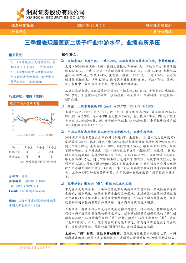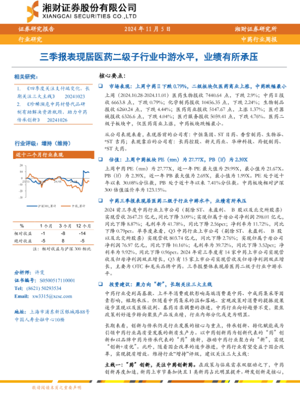 【湘财证券】【20241105】中药行业周报:三季报表现居医药二级子行业中游水平,业绩有所承压-12页