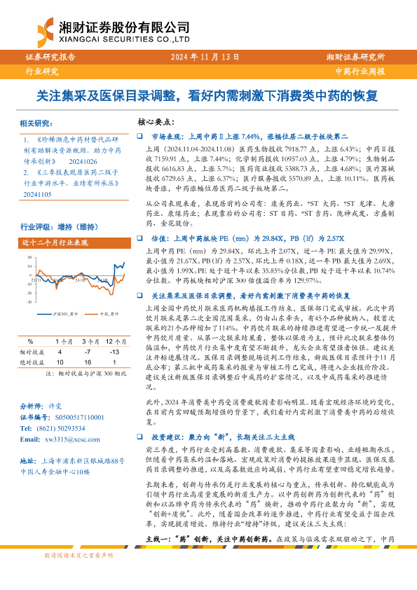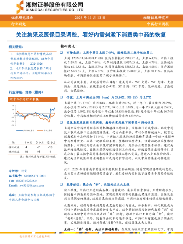 【湘财证券】【20241113】中药行业周报:关注集采及医保目录调整,看好内需刺激下消费类中药的恢复-12页