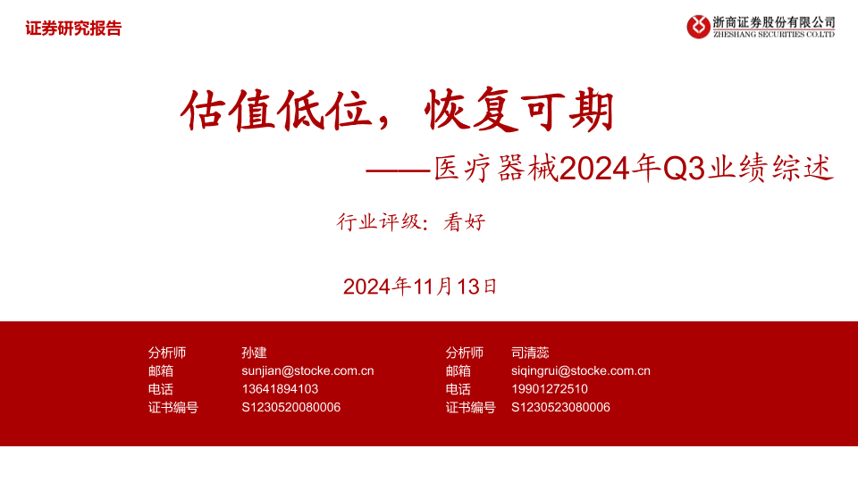 【浙商证券】【20241113】医疗器械2024年Q3业绩综述:估值低位,恢复可期-17页