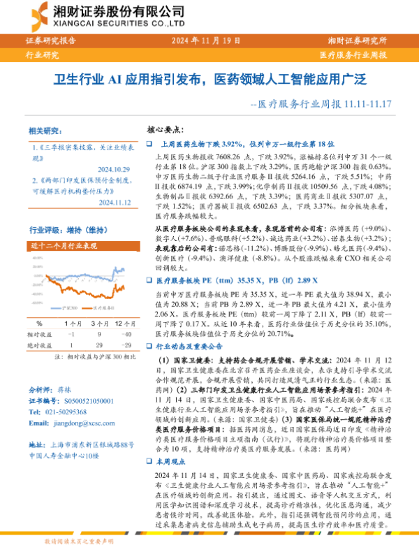 【湘财证券】【20241119】卫生行业AI应用指引发布,医药领域人工智能应用广泛-11页