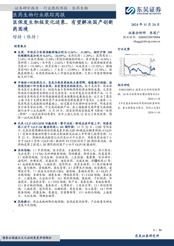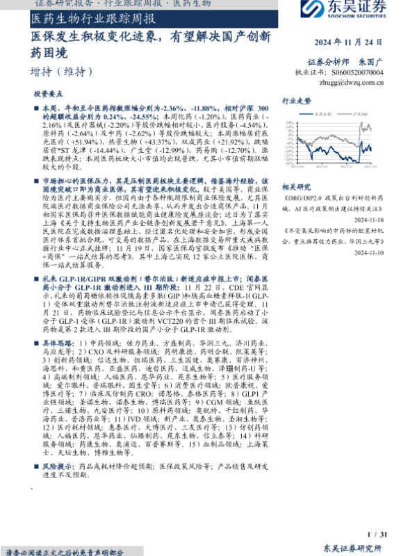 【东吴证券】【20241124】医药生物行业跟踪周报:医保发生积极变化迹象,有望解决国产创新药困境-31页