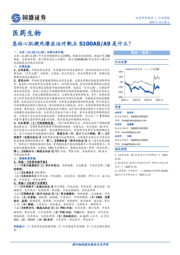 S100A8/A9 医药生物 急性心肌梗死 治疗靶点 行业周报