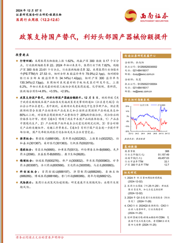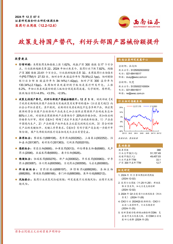 【西南证券】【20241207】医药行业周报:政策支持国产替代,利好头部国产器械份额提升-32页