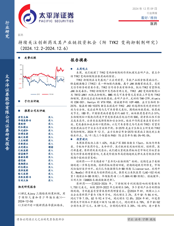 TYK2变构抑制剂 创新药 医药行业 投资机会 银屑病治疗