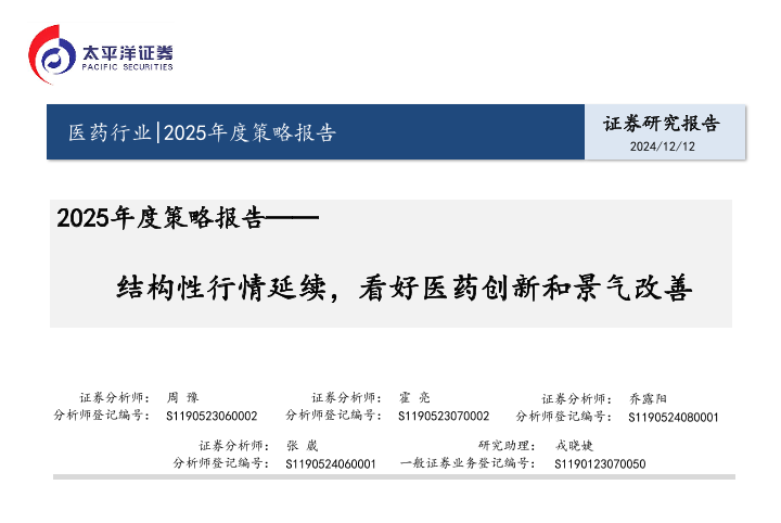 【太平洋证券】【20241212】2025年度策略报告:结构性行情延续,看好医药创新和景气改善-62页