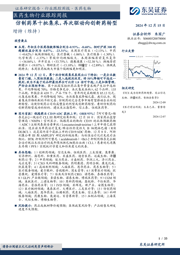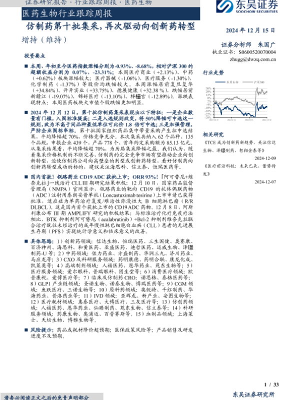 【东吴证券】【20241215】医药生物行业跟踪周报:仿制药第十批集采,再次驱动向创新药转型-33页