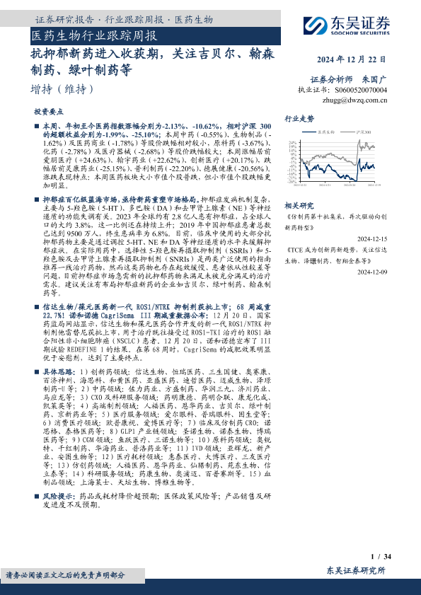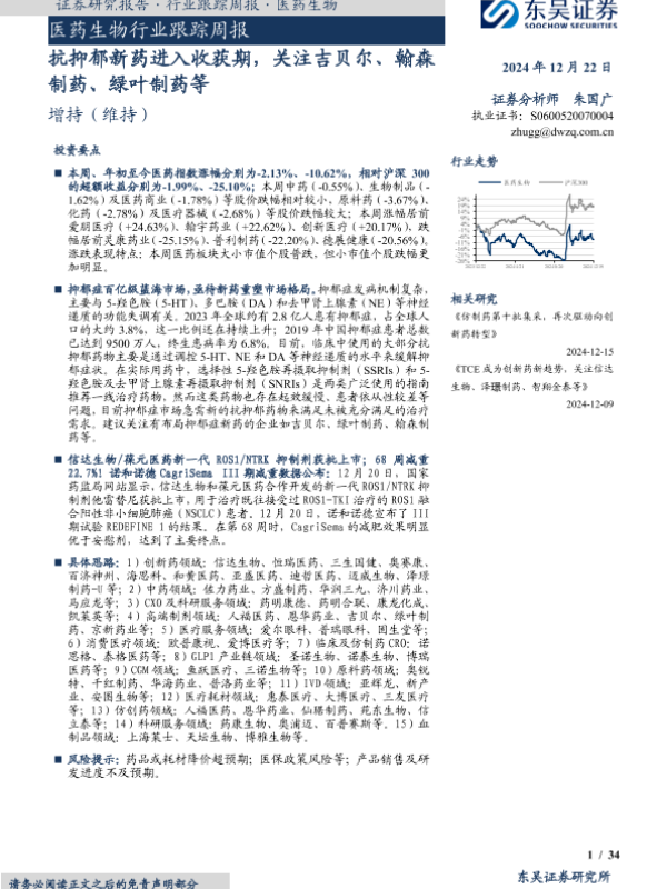 【东吴证券】【20241222】医药生物行业跟踪周报:抗抑郁新药进入收获期,关注吉贝尔、翰森制药、绿叶制药等-34页