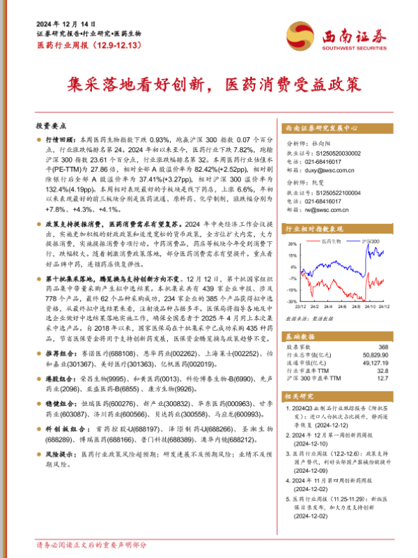【西南证券】【20241214】医药行业周报:集采落地看好创新,医药消费受益政策-33页